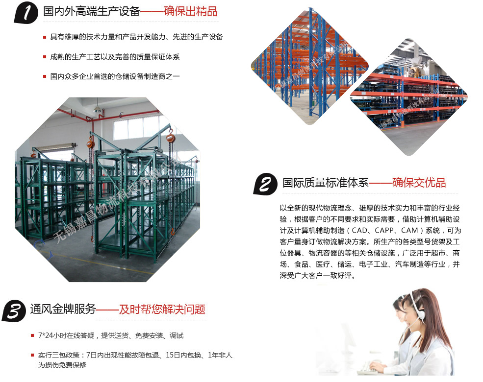 無(wú)錫嘉昌倉(cāng)儲(chǔ)貨架有限公司是國(guó)內(nèi)現(xiàn)代倉(cāng)儲(chǔ)物流技術(shù)開(kāi)發(fā)、設(shè)計(jì)、生產(chǎn)和安裝的專(zhuān)業(yè)廠(chǎng)家,具有雄厚的技術(shù)力量和產(chǎn)品開(kāi)發(fā)能力、先進(jìn)的生產(chǎn)設(shè)備、成熟的生產(chǎn)工藝以及完善的質(zhì)量保證體系。公司始終“以質(zhì)量求生存,以信譽(yù)求發(fā)展的”的經(jīng)營(yíng)理念,放眼世界,積極引進(jìn)、吸收國(guó)際物流行業(yè)先進(jìn)技術(shù),憑借專(zhuān)業(yè)的制作經(jīng)驗(yàn)、優(yōu)秀的產(chǎn)品質(zhì)量,是國(guó)內(nèi)眾多企業(yè)首選的倉(cāng)儲(chǔ)設(shè)備制造商之一。
